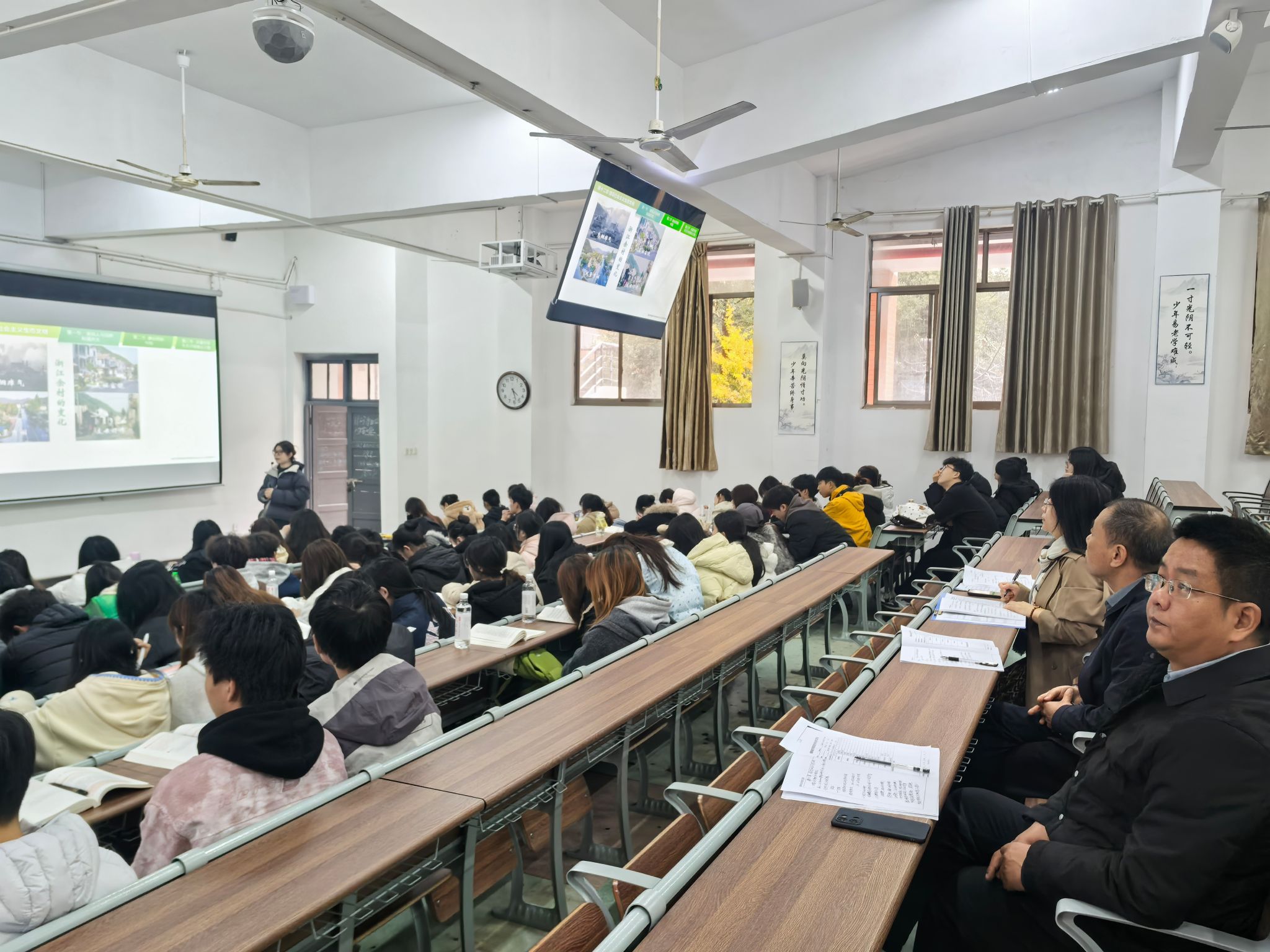 周香兰老师讲授的主题是“建设社会主义生态文明”,徐姝教授及随行领导针对教师课前提供的学生常见问题清单及相关教学材料,认真记录了其教学要点。课后,她对周老师清晰的教学逻辑以及采用案例式、互动式等多元化教学方法给予肯定,并就如何进一步紧密联系社会实际和学生思想关切、增强课堂吸引力和感染力提出了指导性意见。