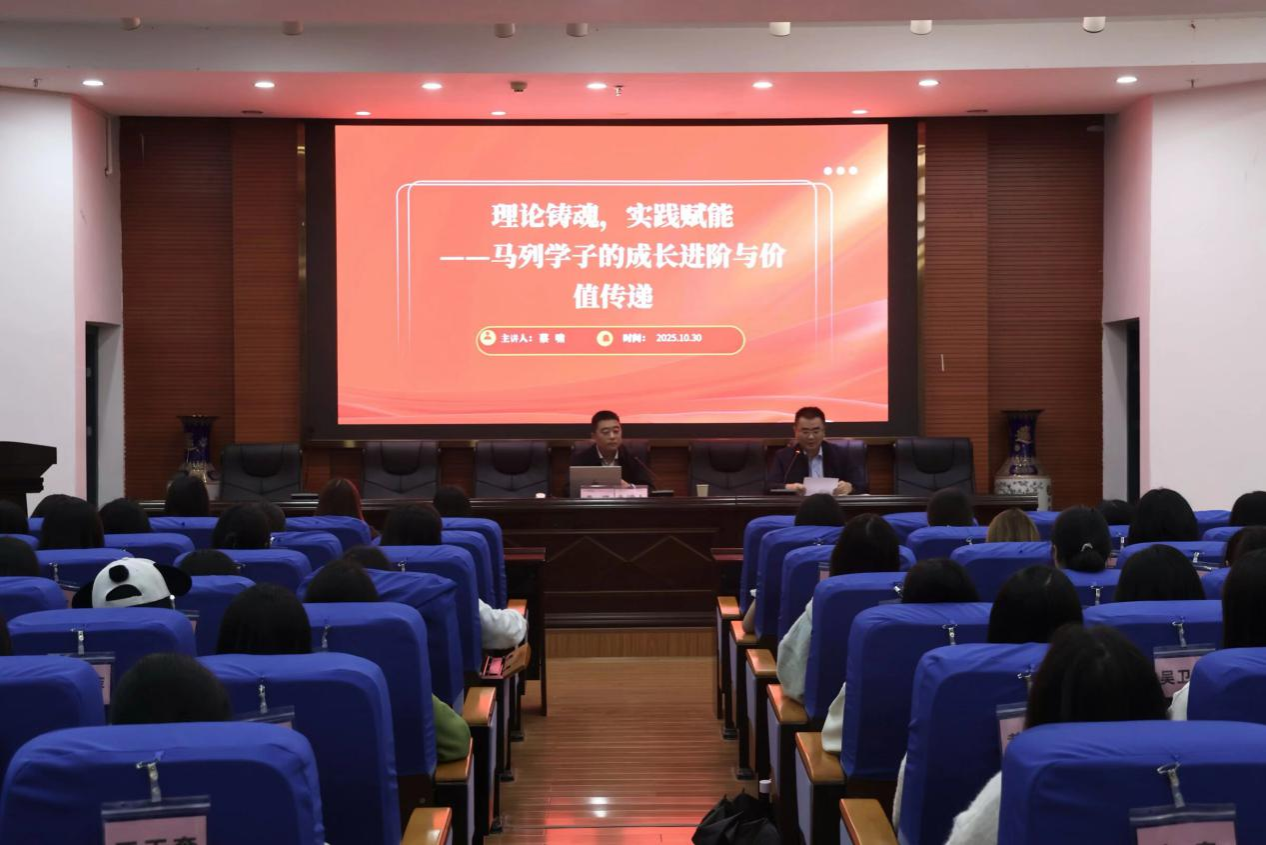 核心分享环节,蔡啸结合自身跨学科求学与民办学校管理实践的经历,从初心、实践、破圈、传承四个维度解析成长路径:初心是理论深度与现实温度的平衡,马列理论需与实际结合方能彰显生命力;实践层面要实现“扎根”与“破圈”共振,既要深耕专业探寻与法律、新媒体等领域的交叉点,也要学会将抽象理论转化为通俗表达;面对成长迷茫,要学会接纳并主动寻求突围,发掘优势、转化短板;成长的终极意义在于坚守信仰与传递力量,马院学子要活成“两束光”,既照亮自己的信仰之路,也照亮他人的前行方向。